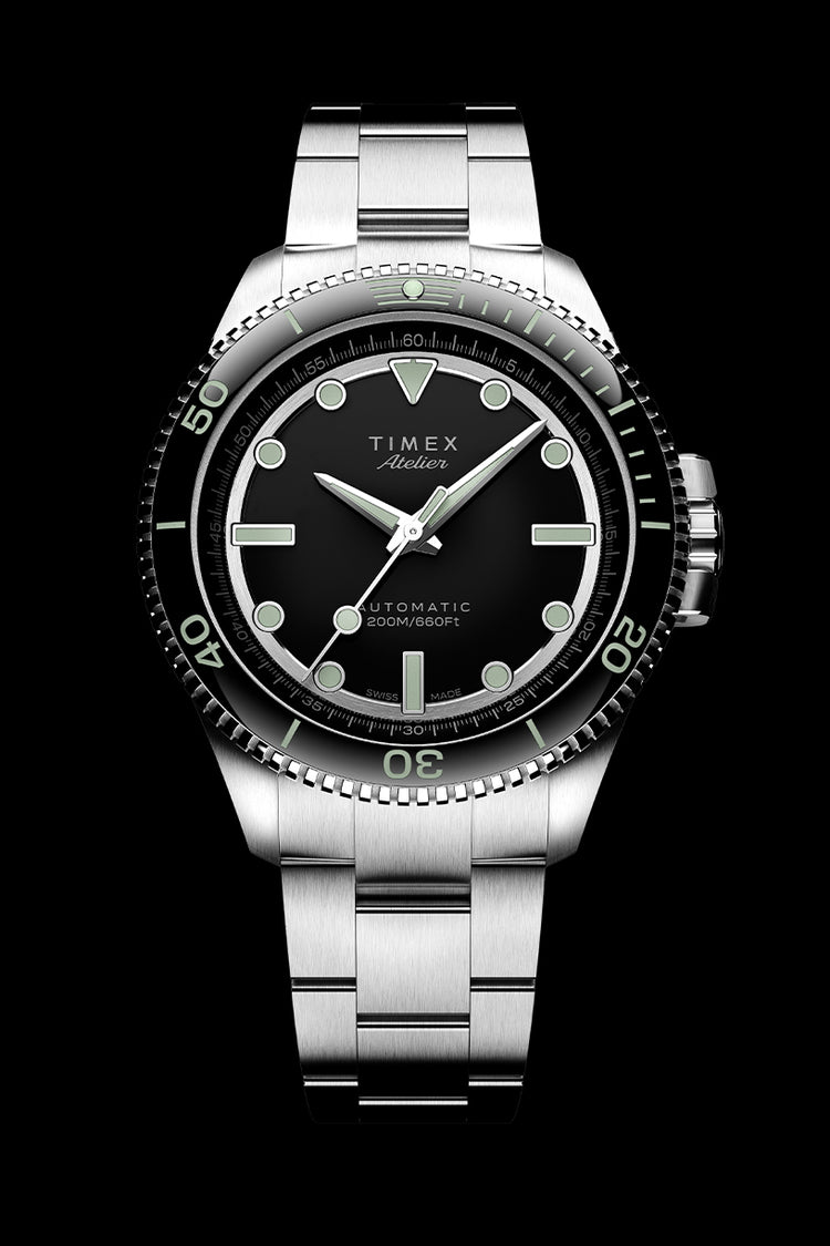 Side perspective of the Timex Atelier automatic dive watch, highlighting its stainless steel case, black rotating bezel, luminous indices, and bracelet. Side perspective of the Timex Atelier automatic dive watch, highlighting its stainless steel case, black rotating bezel, luminous indices, and bracelet.