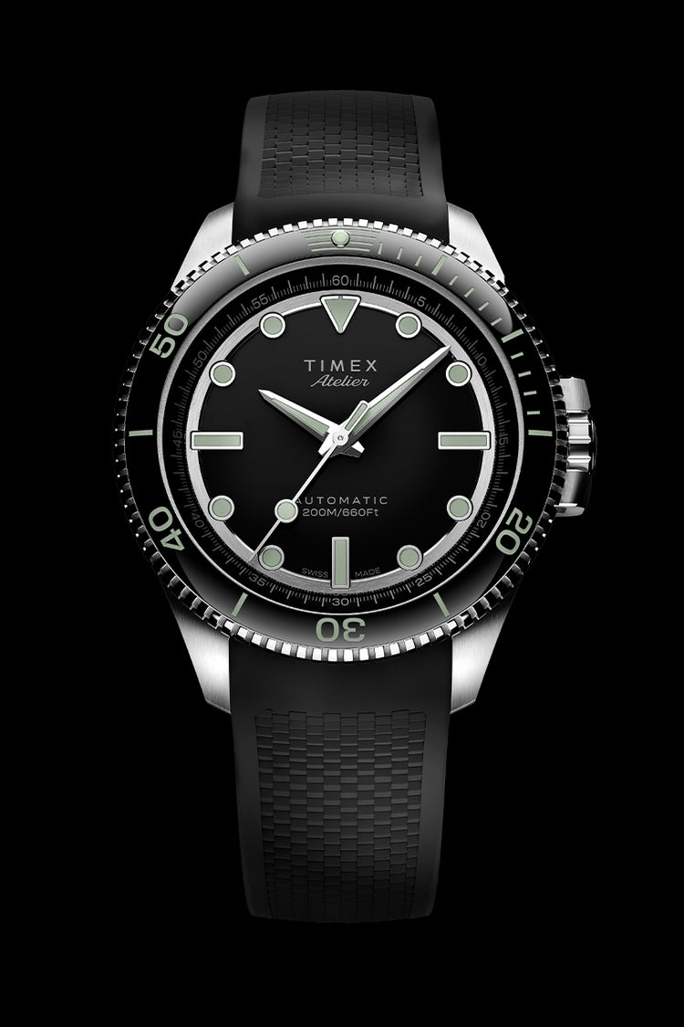 A Timex Atelier automatic dive watch with a black dial, luminous markers, rotating bezel, and a textured black rubber strap, shown in a close-up angled view against a black background. A Timex Atelier automatic dive watch with a black dial, luminous markers, rotating bezel, and a textured black rubber strap, shown in a close-up angled view against a black background.