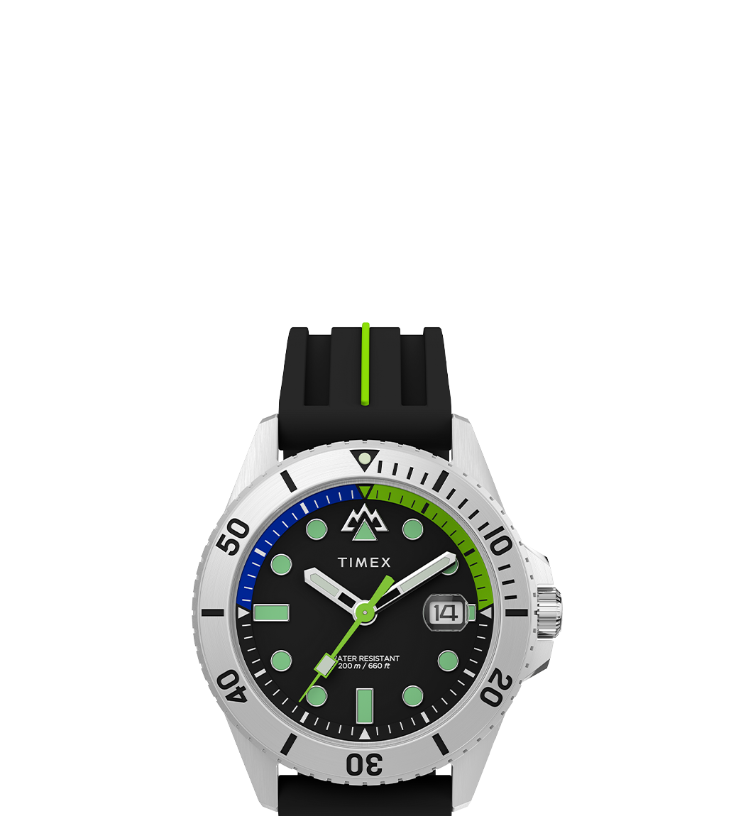 Our Anchorage brings a brand new 42mm stainless-steel case design to our rugged Expedition lineup. This watch boasts the authentic look of a true diver watch, with energizing blue and lime details; sizeable luminescent hour markers and hands; a scratch-resistant, anti-reflective sapphire crystal with date magnifier for enhanced viewing; and a unidirectional ratcheting bezel for tracking elapsed time. Opt for a sporty look with a quick-release co-molded silicone strap.