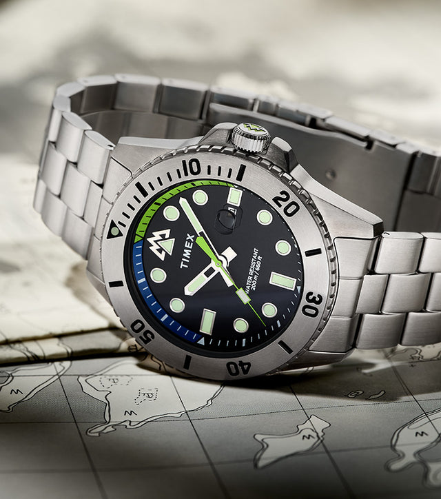 Our Anchorage brings a brand new 42mm stainless-steel case design to our rugged Expedition lineup. This watch boasts the authentic look of a true diver watch, with energizing blue and lime details; sizeable luminescent hour markers and hands; a scratch-resistant, anti-reflective sapphire crystal with date magnifier for enhanced viewing; and a unidirectional ratcheting bezel for tracking elapsed time. Opt for a more contemporary aesthetic with a corrosion-resistant stainless-steel bracelet.Specifications