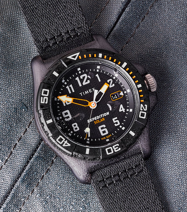 Rain or shine, inland or coast—Expedition goes the distance. Inspired by those who seek to preserve our planet, the new Expedition Free-Dive Ocean is equipped with several eco-friendly features: a solar-powered movement that lasts up to 4 months and eliminates the need for battery changes; a rugged black case and comfortable strap made of #tide™ upcycled, ocean-bound plastic; and all-paper packaging. Of course, this collection doesn’t skimp on style either—the substantial 46mm case features a diver-inspired design with a unidirectional bezel and sturdy crown guard. The black dial, featuring nautical patterns reminiscent of previous Timex diver-style watches, boasts a date window and large, easy-to-read hand and hour markers. Finally, its 50-meter water resistance rating allows you to make the most out of your time in the ocean without leaving this piece ashore.Specifications