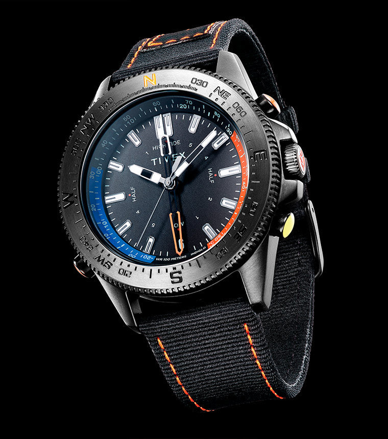 Crafted from 316L stainless steel, this timepiece is literally built for the long haul, from the curves of its rugged case to the tactile experience of its pushers. The watch also features an anti-reflective sapphire crystal, luminescent hands and hour markers, a comfortable fabric strap made from 100% recycled plastic and a water resistance rating of 100 meters. And thanks to our proprietary Tide-Temp-Compass movement’s bidirectional center hand that reflects local tide and temperature conditions and points you in the right direction, our Expedition Tide-Temp-Compass is a must-have piece of gear to take you from street to summit and back again.Specifications
