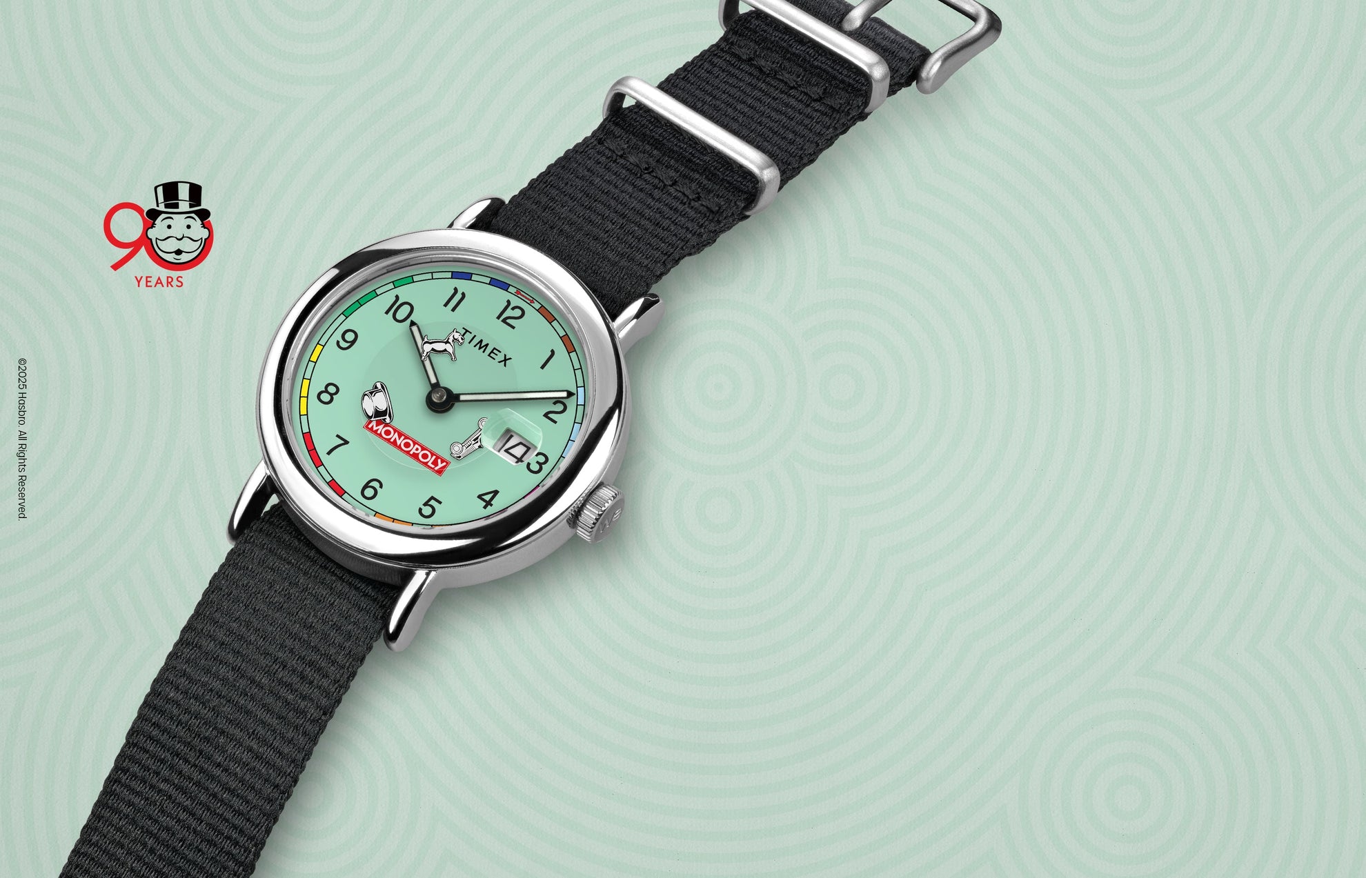 In celebration of Monopoly's 90th anniversary, this special edition of our Timex Weekender features the game’s beloved tokens on its customized floating second hand. Encircling the green dial is a colorful rail track, paired with clean Arabic numerals to mark the hours. You’ll find a magnified date window beside 3 o’clock, while luminant hands and our INDIGLO® backlight ensure you can still see the time if your gameplay takes you into the wee hours of the night. And because it’s finished with an eco-friendly recycled plastic fabric strap with a clever slip-thru design, this collectible timepiece lets you switch up your look as easily as passing GO.Specifications