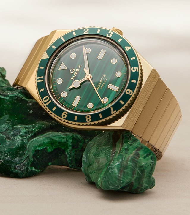 Our Women’s Q Timex brings the healing energy of the earth to your everyday look with a brilliant green malachite stone dial. Believed to cleanse the body of negativity and inspire positive transformation, natural malachite features unique striations that make each dial as one-of-a-kind as you. The brushed and polished 36mm gold-tone stainless-steel case is accented with a green bezel that beautifully complements the rich, earthy tones of the dial, and we’ve paired this beauty with our Perfect Fit stainless-steel expansion band for a hassle-free, custom fit. Echoing the heritage of our original Q Timex 1979 Reissue, this timepiece also boasts iconic features like a rotating bezel, functional battery hatch, and domed acrylic crystal.Specifications