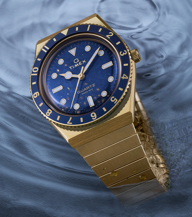 Our Women’s Q Timex brings the healing energy of the earth to your everyday look with brilliant blue lapis lazuli stone dial. Believed to cleanse the body of stress and promote spiritual growth, natural lapis lazuli features a deep blue coloring—often with flecks of golden pyrite—that makes each dial as one-of-a-kind as you. The brushed and polished 36mm gold-tone stainless-steel case is accented with a navy bezel that beautifully complements the rich, earthy tones of the dial, and we’ve paired this beauty with our Perfect Fit stainless-steel expansion band for a hassle-free, custom fit. Echoing the heritage of our original Q Timex 1979 Reissue, this timepiece also boasts iconic features like a rotating bezel, functional battery hatch, and domed acrylic crystal.Specifications