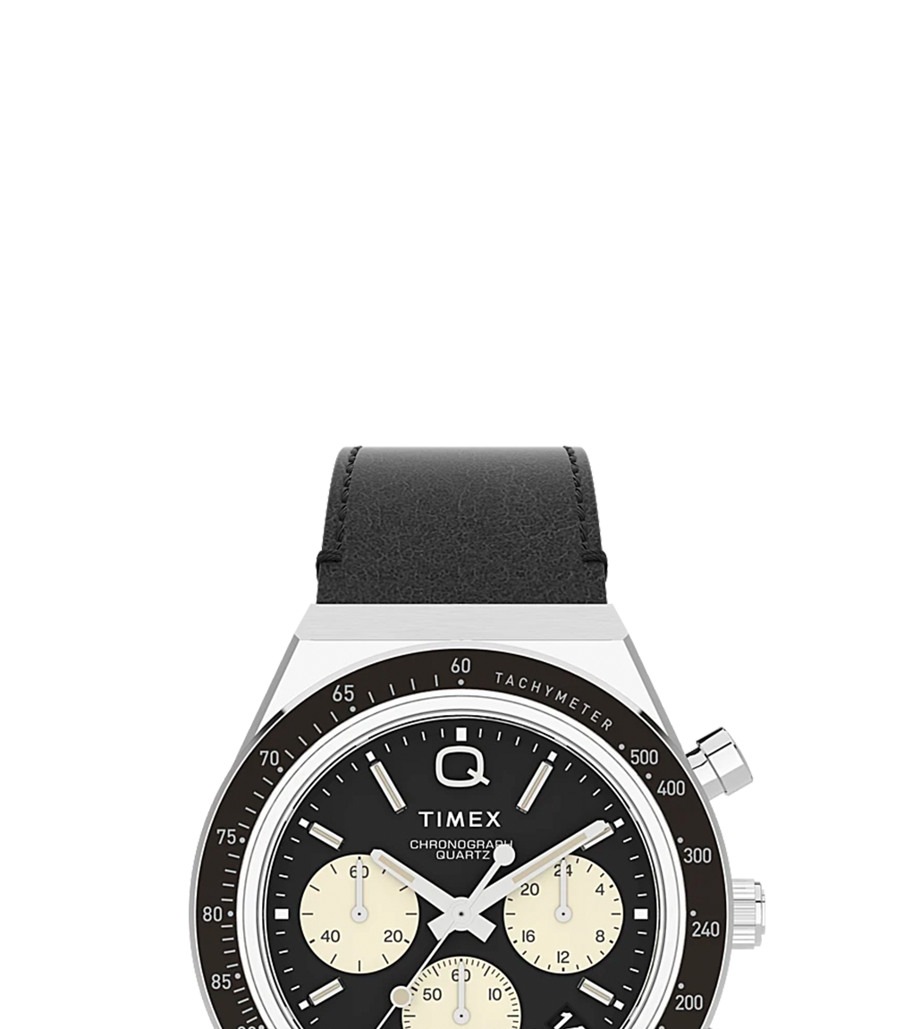 Roar across the finish line with our high-performing Q Timex Chronograph. Inspired by the original motoring watches that graced the tracks of Europe’s most iconic races, this timepiece celebrates the endurance of our legendary 1970s Q Timex. An ultra-precise chronograph movement and black tachymeter bezel recreate the finesse and function of a true racing watch, allowing you to determine elapsed time and average speed like the greatest daredevils in motorsports. Contrasting sub-dials, a date feature, hand-applied dimensional indices, and an updated Q Timex logo smolder against a jet-black dial, while a brushed and polished stainless-steel case and crown bring dynamism and durability to its retro construction. Infinitely wearable, a black leather strap with quick-release spring bars makes for a sporty presentation that’s ready to hit the road whenever you are.