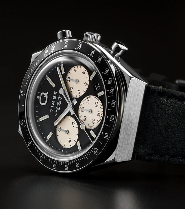 Roar across the finish line with our high-performing Q Timex Chronograph. Inspired by the original motoring watches that graced the tracks of Europe’s most iconic races, this timepiece celebrates the endurance of our legendary 1970s Q Timex. An ultra-precise chronograph movement and black tachymeter bezel recreate the finesse and function of a true racing watch, allowing you to determine elapsed time and average speed like the greatest daredevils in motorsports. Contrasting sub-dials, a date feature, hand-applied dimensional indices, and an updated Q Timex logo smolder against a jet-black dial, while a brushed and polished stainless-steel case and crown bring dynamism and durability to its retro construction. Infinitely wearable, a black leather strap with quick-release spring bars makes for a sporty presentation that’s ready to hit the road whenever you are.Specifications