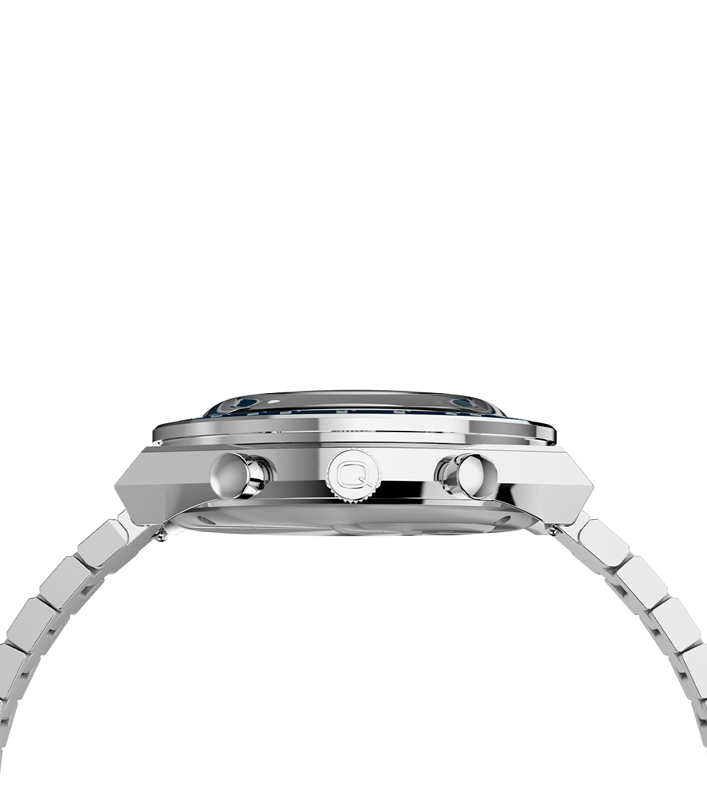Roar across the finish line with our high-performing Q Timex® Chronograph. Inspired by the original motoring watches that graced the tracks of Europe’s most iconic races, this timepiece celebrates the endurance of our legendary 1970s Q Timex. An ultra-precise chronograph movement and tachymeter bezel recreate the finesse and function of a true racing watch, allowing you to determine elapsed time and average speed like the greatest daredevils in motorsports. Contrasting sub-dials, a date feature, hand-applied dimensional indices, and an updated Q Timex logo stand beautifully against a midnight dial, while a stainless-steel crown and brushed and polished 40mm stainless-steel case bring dynamism and durability to its retro construction. Infinitely wearable, it presents with a sleek stainless-steel bracelet.