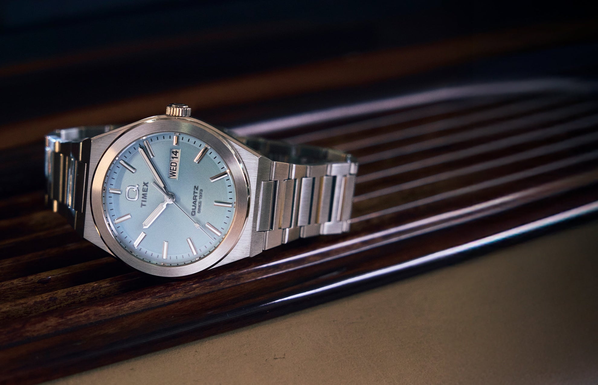 Channeling the bold designs and decadent glamour that filled the scene in ‘70s West Hollywood, the Q Timex® Continental brings refinement to our beloved Q Timex collection with a new streamlined 39mm brushed stainless-steel case with polished edges and a day and date window at 3 o’clock. The simple aquamarine dial features a radial texture and a clean presentation that’s effortlessly cool, protected by a flat mineral glass crystal and highlighted by faceted metallic hour markers and luminant hands for enhanced visibility in the dark. Completing the look is a tapered and integrated brushed stainless-steel bracelet that offers a truly ‘70s style as you let the hours slip away.Specifications