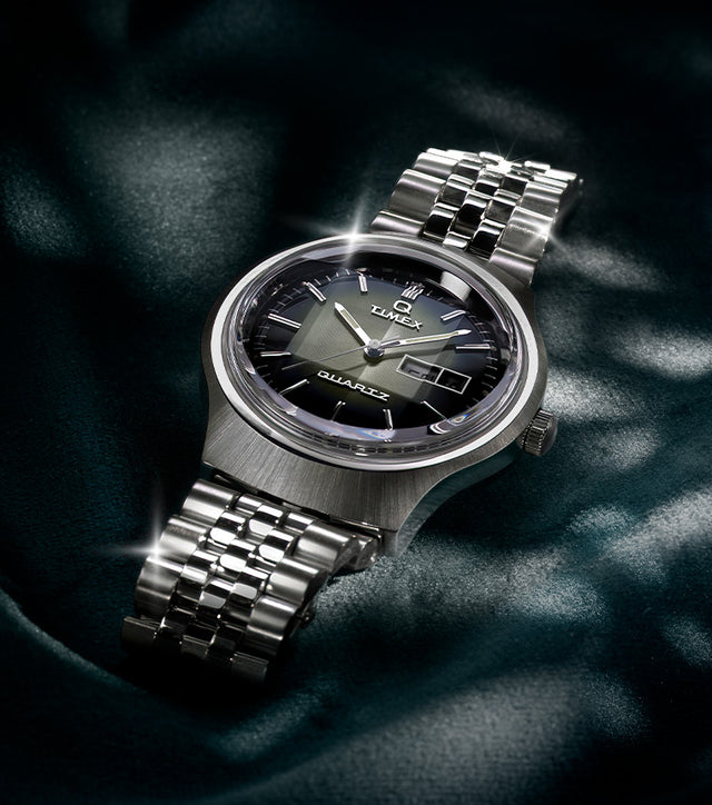 Our Q Timex Reissue Dégradé is a stunning homage to one of our most iconic Q models from the late ‘70s. It remains faithful to the original design with a unique domed acrylic crystal boasting intricate interior facets that catch and refract light to produce a captivating illusion of depth and texture. As light hits the lustrous dégradé dial, a beautiful, complex display of smoky color is revealed. Its allure extends further with a sleek 38mm brushed stainless-steel case, matching stainless-steel bracelet, and a day and date window as the third hour marker. Keeping with its Q heritage, this timepiece boasts the precision of a quartz movement, ensuring impeccable accuracy for those on the move.Specifications
