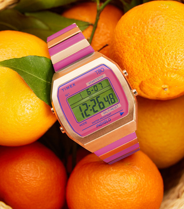 Dive into a world of color and luxe. Our Timex T80 transports you to sun-soaked days in faraway destinations with a lens and stainless-steel Perfect Fit™ expansion band in a captivating colorway that brightens up all your vacation looks. Other details include all you’d expect from our T80 – a chronograph function, daily alarm, INDIGLO® backlight, and date display.Specifications