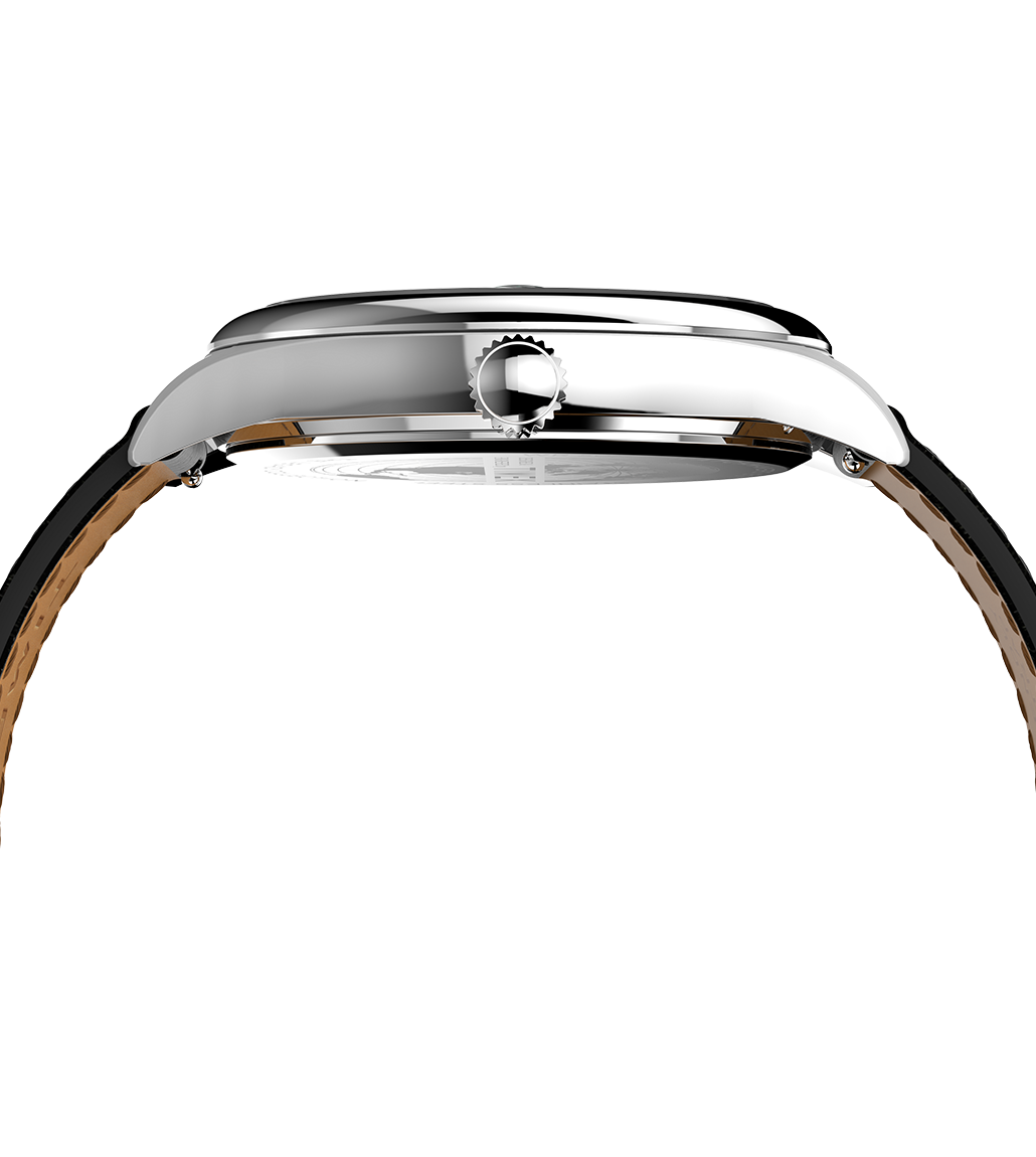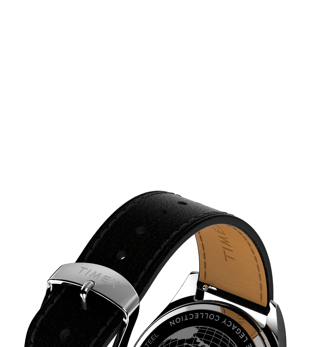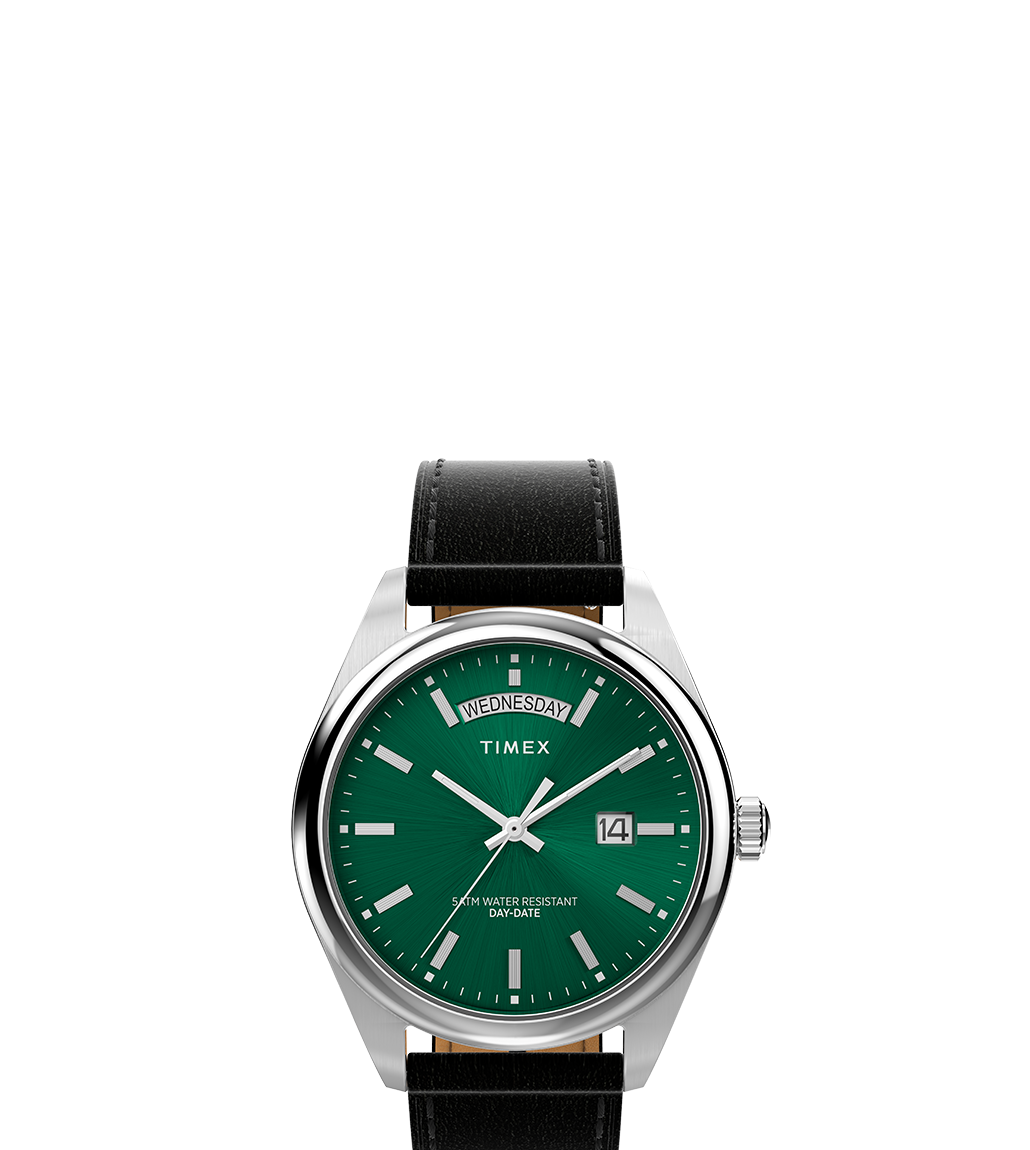 A fresh take on a traditional watch, the Timex Legacy never fails to find new ways of telling our story. This timeless piece embraces modern watchmaking with easy-to-wear proportions, now updated with an eco-friendly black vegan leather strap. Its recycled stainless-steel case houses a green sunray dial with applied indices, a movement with the day of the week spelled out in full at the 12 o’clock position, and a magnified date window at the 3rd hour marker. It’s a 41mm goes-with-anything watch—a testament to our heritage and well-suited for everyday wear.