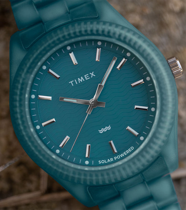 We’re redesigning our past to take care of our future with the Timex Legacy Ocean collection. Built with a solar-powered movement and a case, bracelet, and dial crafted from plastic that’s upcycled from ocean-bound waste, this remarkable wristwatch is the first Timex of its kind. Our partnership with #tide™ means its journey from waste to wrist begins with fishermen collecting plastic from the coastlines; the waste is washed and shredded before making its way to Switzerland via carbon-neutral transportation; and finally, it’s repurposed on-site, resulting in a premium, sustainable material. The blue marine-inspired dial features a unique wave pattern, while the classic Timex Legacy construction itself honors our rich heritage in traditional watchmaking. Navigate uncharted waters ahead with all the trusted functionality you’d expect from a Timex—luminant hands and 30m of water resistance—and join us in working toward a cleaner tomorrow.Specifications