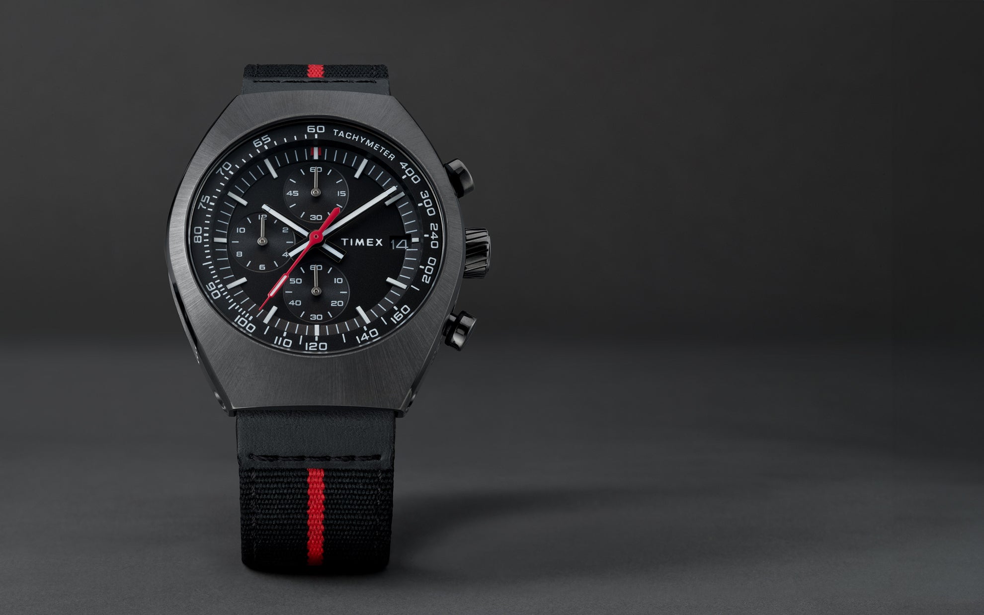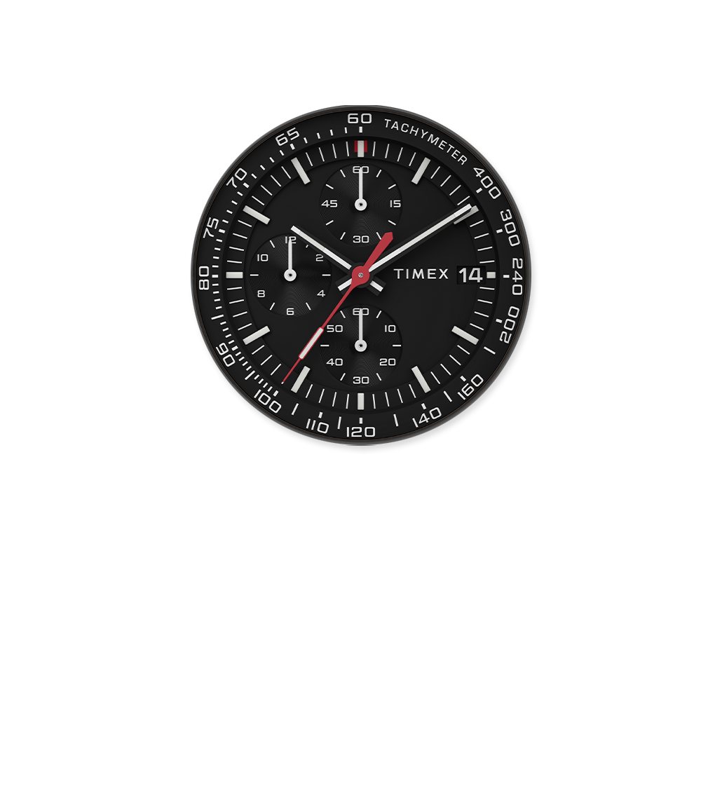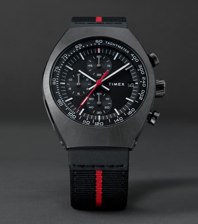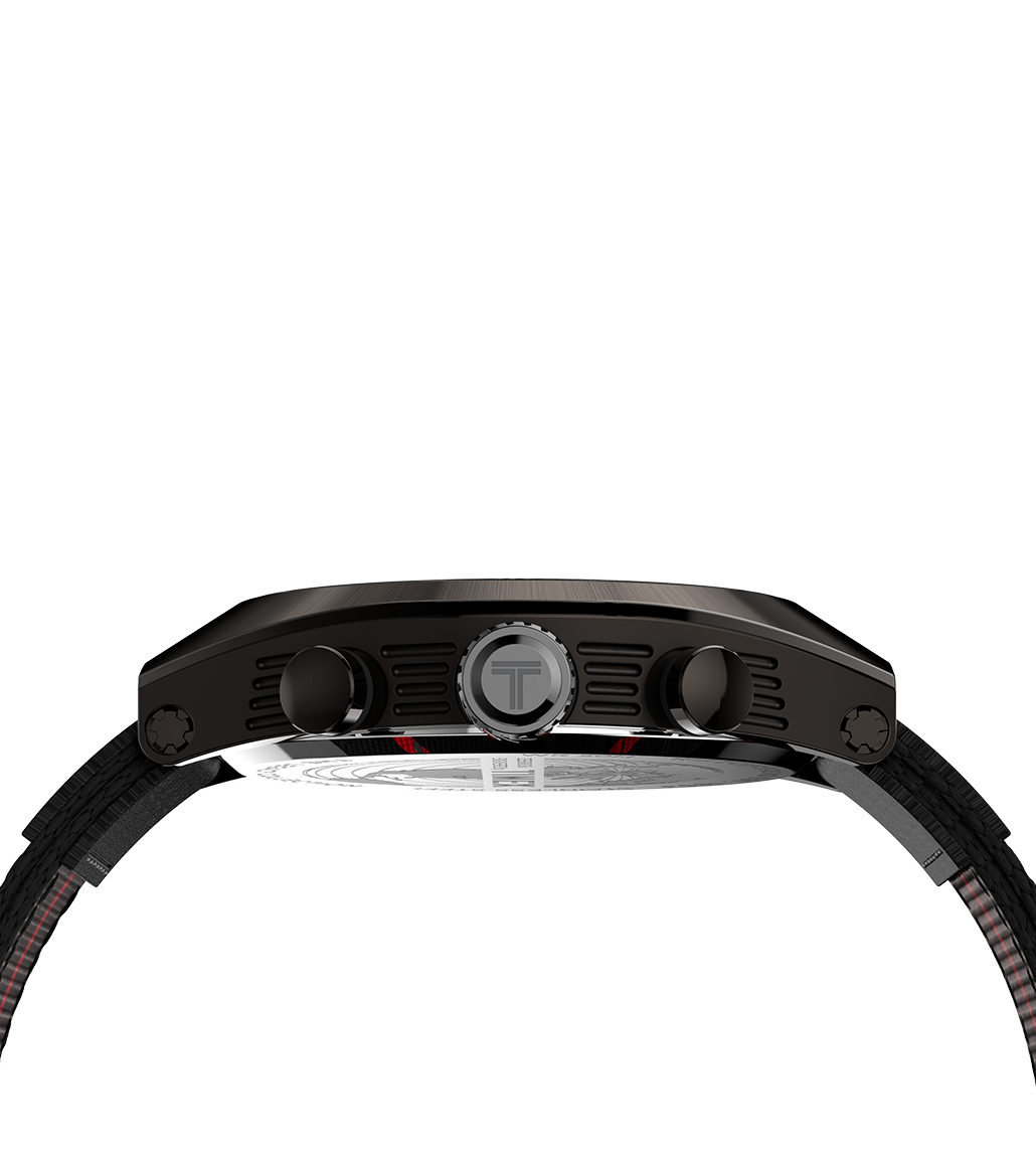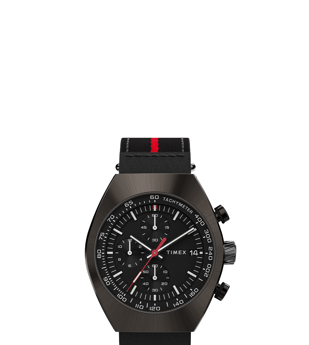 The striking appearance of our Timex Legacy Tonneau Chronograph draws inspiration from the iconic watch styles of the ‘70s. Its sizeable 42mm barrel-shaped stainless-steel case has a lug-to-lug width of 46mm, and houses a round opening with an elaborate, multi-layered black dial with a date window as the 3 o’clock marker. Intricate detailing on the crown and case sides paired with integrated hidden lugs bring this polished timepiece even more sophistication, while the two-piece recycled fabric strap with leather tabs at the spring bars completes its handsome profile.