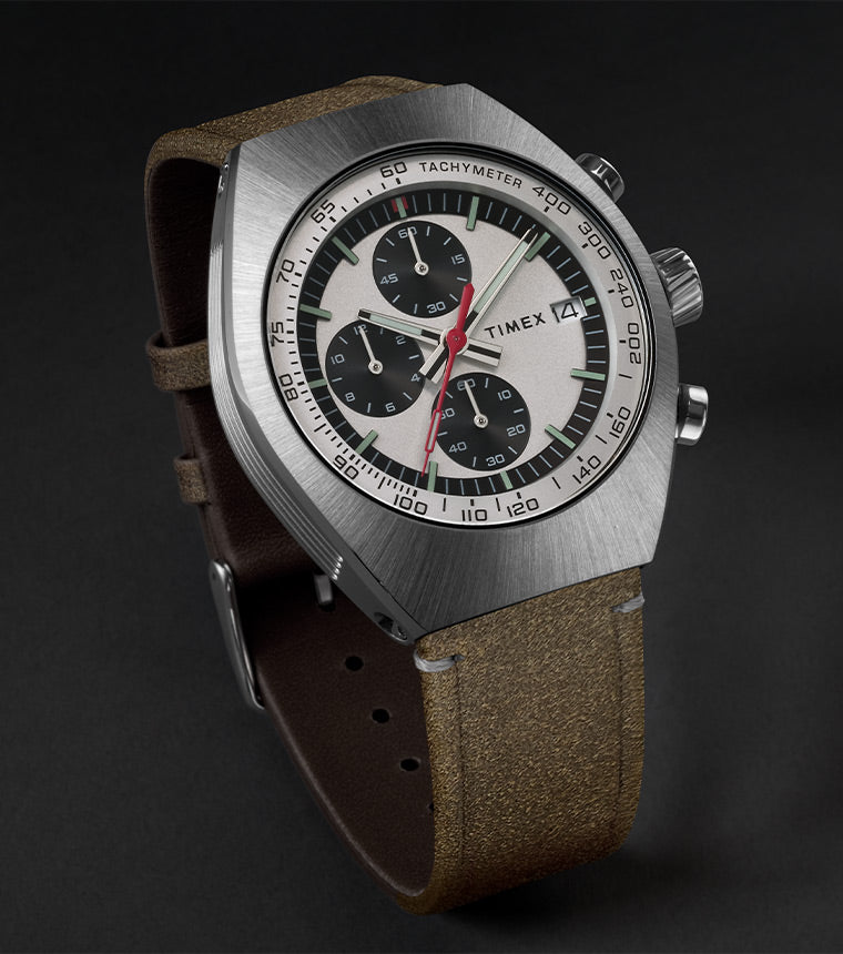 The striking appearance of our Timex Legacy Tonneau Chronograph draws inspiration from the iconic watch styles of the ‘70s. Its sizeable 42mm barrel-shaped stainless-steel case has a lug-to-lug width of 46mm, and houses a round opening with an elaborate, multi-layered silver-tone dial with a date window as the 3 o’clock marker. Intricate detailing on the crown and case sides paired with integrated hidden lugs bring this polished timepiece even more sophistication, while an eco-friendly distressed natural leather strap sourced from the Leather Working Group® (LWG) and enhanced with accent side stitches completes its handsome profile.
