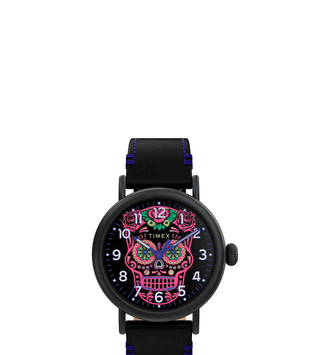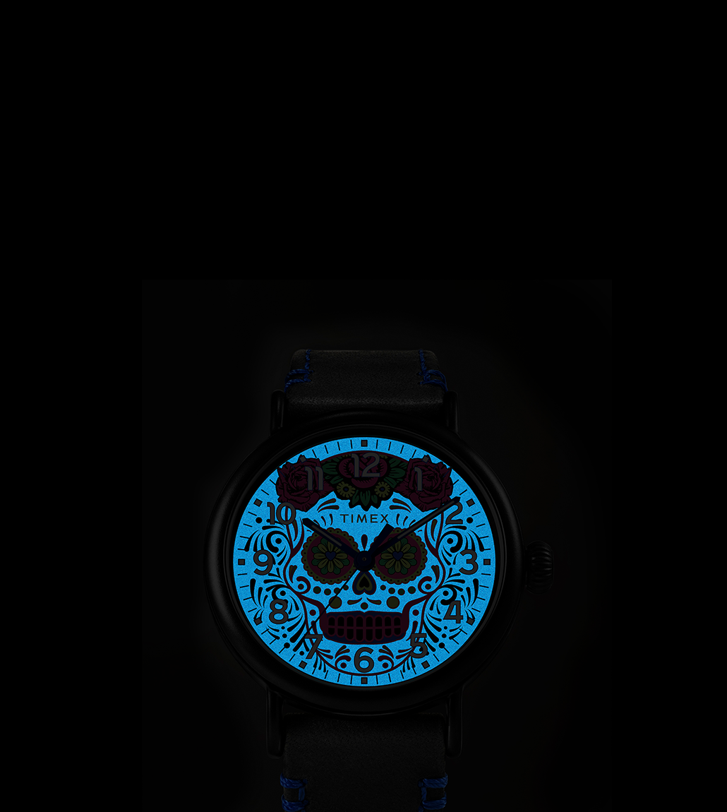 Hay que vivir sonriendo, para morir contentos. In Mexican culture, Dia de los Muertos is a time to remember loved ones no longer sharing this life with us. To celebrate this day and its rich traditions, we've created a special edition of our Waterbury Standard watch featuring a black dial with an intricate skull graphic, framed by a black-tone case and paired with a black natural leather strap. The watch’s glowing INDIGLO® backlight also gives new vibrancy to the skull design, highlighting it when you press the watch's crown. This marked passage of time — the ticking of seconds, minutes, and hours — should help remind us that we must embrace the changes of life if we hope to die with smiles on our faces.