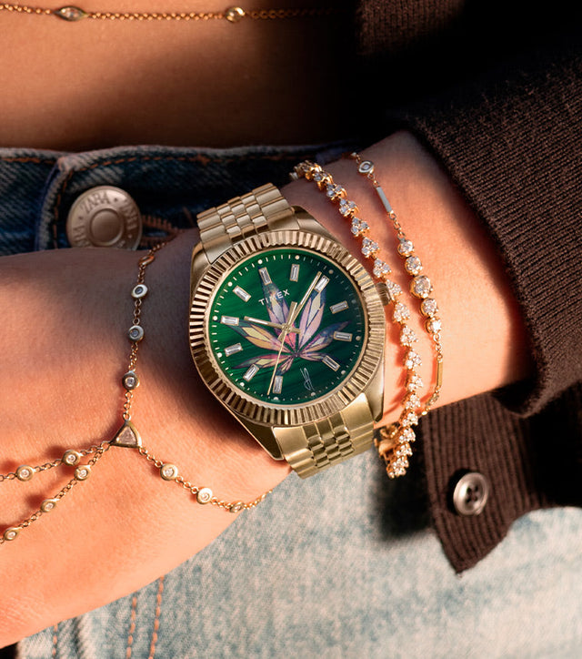 The High Life Collection brings together style, bliss, and the power of the present moment. The sweet leaf is our signature symbol of happiness. Modeled after the botanical beauty of the marijuana leaf, this design is meant to inspire freedom and bring a unique sense of empowerment to your daily essentials with its verdant malachite stone dial. Crafted in a generous 41mm size, this watch is certain to leave a lasting impression wherever you go.With powerful protection properties, malachite stone is like a personal, protective shield. It is known to direct high vibrational and cleansing energy to areas within that are in need of love.