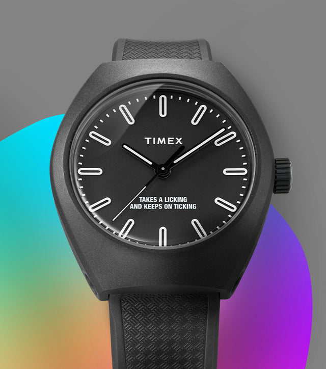 Our Urban Pop proves that sustainable fashion doesn’t have to skimp on quality or style. This watch keeps things sleek and clean with a sturdy 40mm eco-ceramic case made from a special blend of ceramic and bio-based resin derived from castor plants, paired with a subtly textured bio-based resin strap that’s comfortable and effortlessly cool. The minimalist dial with high-contrast markers proudly rocks the slogan “Takes a licking and keeps on ticking” as a shout-out to Timex’s legendary durability and an ode to our planet’s unwavering resilience.Specifications