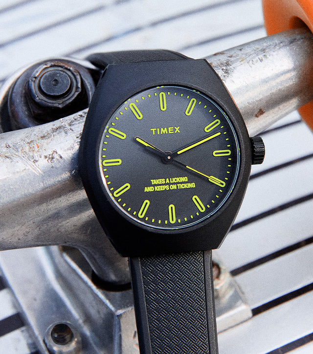 Our Urban Pop proves that sustainable fashion doesn’t have to skimp on quality or style. This watch keeps things sleek and clean with a sturdy 40mm eco-ceramic case made from a special blend of ceramic and bio-based resin derived from castor plants, paired with a subtly textured bio-based resin strap that’s comfortable and effortlessly cool. The minimalist dial with high-contrast markers proudly rocks the slogan “Takes a licking and keeps on ticking” as a shout-out to Timex’s legendary durability and an ode to our planet’s unwavering resilience.Specifications