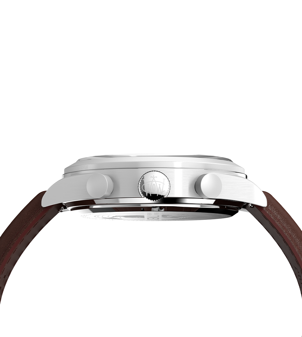 Built with our proprietary fly-back chronograph movement designed in Pforzheim, Germany, the dial of our Waterbury Traditional Fly-Back Chronograph houses fan-shaped sub-dials at the 4 o'clock and 10 o'clock positions with retrograde hands. A single press of the fly back pusher instantly resets the chronograph to display the current time in the current lap without the need to stop and reset, and when the chronograph isn’t in use, the upper sub-dial doubles as a second time zone indicator. This watch boasts a robust 43mm stainless-steel case paired with a cruelty-free vegan leather strap. Other notable details include a date window positioned at 2:30, luminous hour and minute hands for enhanced visibility, 100m of water resistance, and the iconic stylized W of the Waterbury Watch Company logo displayed on the crown, sweep second hand, and beside the 7th hour marker.